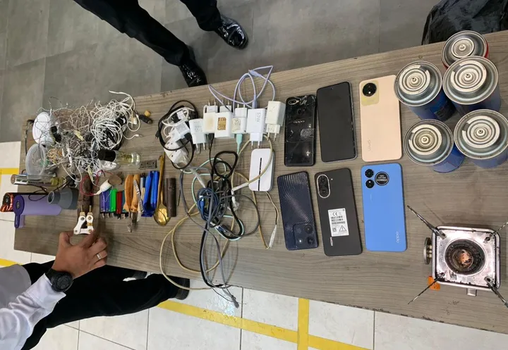 Dari hasil razia, petugas menemukan sejumlah barang terlarang yang dibawa warga binaan, seperti beberapa unit handphone, gas portable, korek gas, kompor portable, cutter, tang, kabel charger, headset, serta botol parfum.